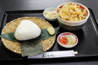 (でっけえおにぎり、かき揚げ、そばまたはうどん、小鉢)